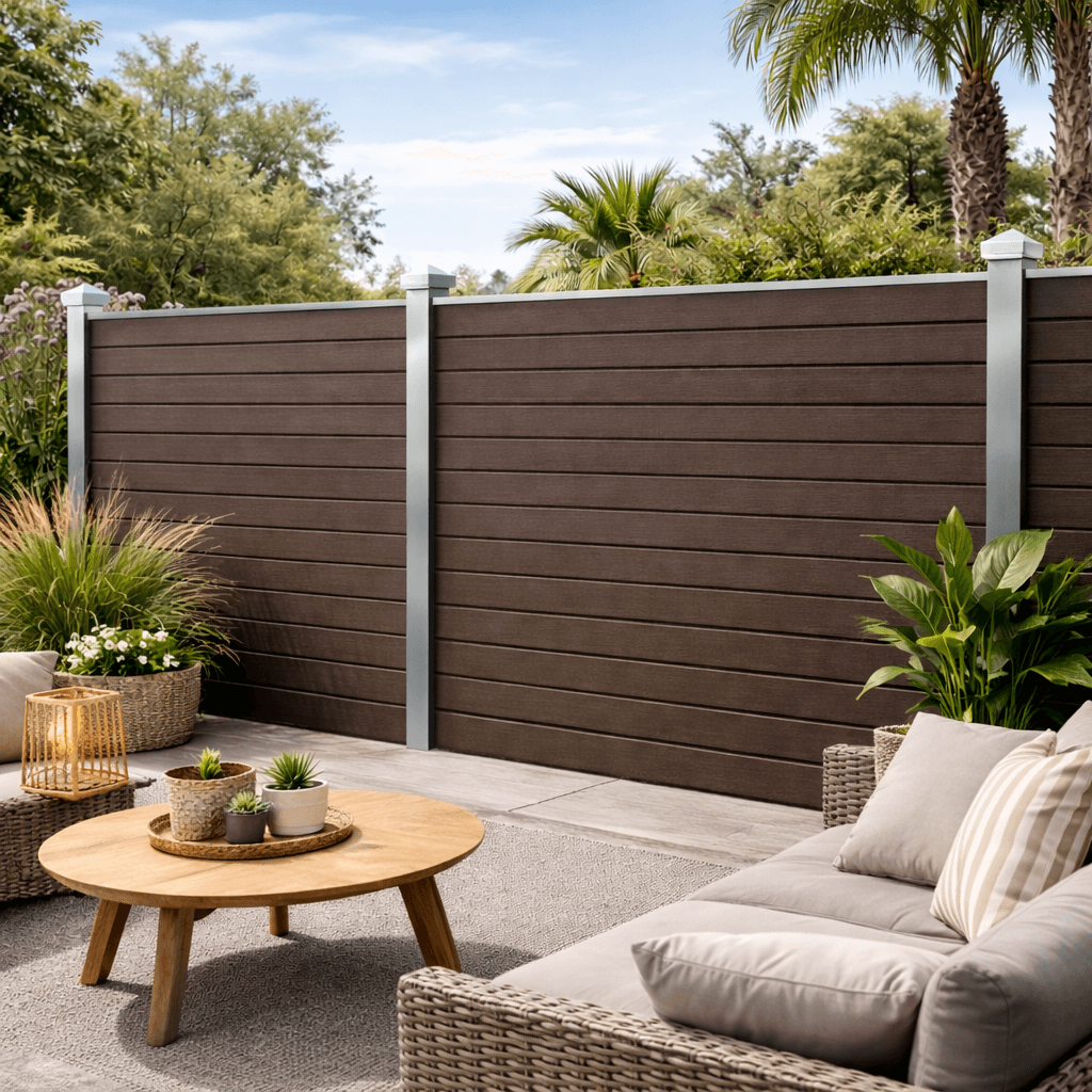 Συνθετικό Deck WPC περίφραξης εξωτερικού χώρου που αποτελείται από 55% ξύλο και 35% HDPE και 10% ρητίνες, UV σταθεροποιητές κλπ. Είναι διπλής όψης με στενό χτένι στη μία όψη και φαρδύ στην άλλη. Η περίφραξη με WPC έχει προσιτή τιμή και είναι κατάλληλη για πολλές εφαρμογές όπως περίφραξη οικοπέδου, κήπου ή πισίνας, εξωτερική περίφραξη, επένδυση τοίχου, φράχτη, αυλόπορτας κτλ.