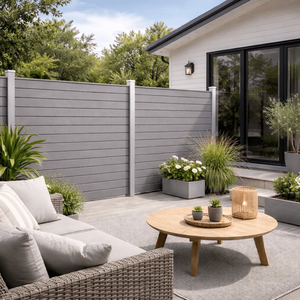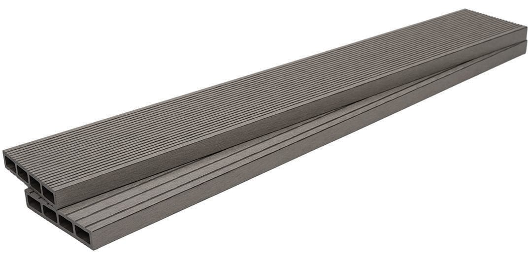 Συνθετικό Deck WPC περίφραξης εξωτερικού χώρου που αποτελείται από 55% ξύλο και 35% HDPE και 10% ρητίνες, UV σταθεροποιητές κλπ. Είναι διπλής όψης με στενό χτένι στη μία όψη και φαρδύ στην άλλη. Η περίφραξη με WPC έχει προσιτή τιμή και είναι κατάλληλη για πολλές εφαρμογές όπως περίφραξη οικοπέδου, κήπου ή πισίνας, εξωτερική περίφραξη, επένδυση τοίχου, φράχτη, αυλόπορτας κτλ.